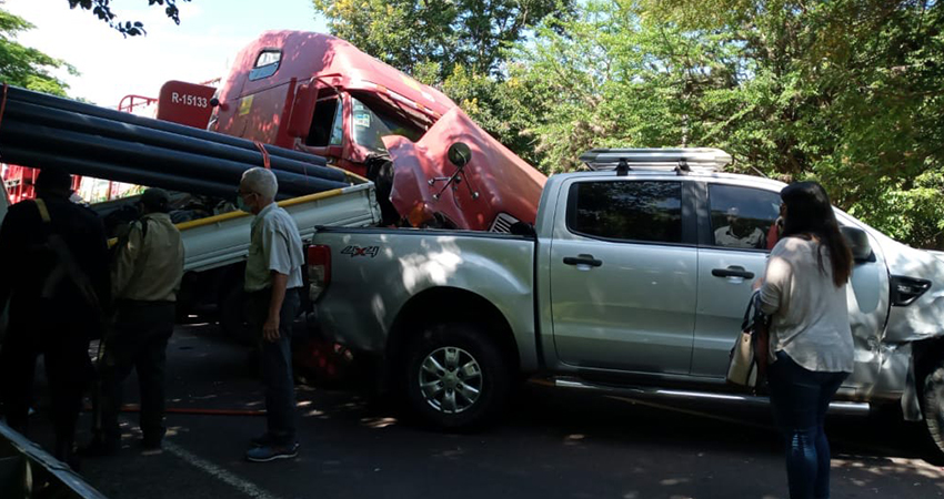 Producto del impacto, el automotor además de estrellarse contra una valla metálica, quedó atravesado en la vía y la parte de atrás encima de la rastra, la cual iba cargada de refrescos. En el mismo accidente de tránsito se vieron involucrados otros tres vehículos.La múltiple colisión se registró el viernes en el kilómetro 192 de la carretera panamericana en la comunidad de Ducualí, entre el municipio de Condega departamento de Estelí y Palacagüina, Madriz.